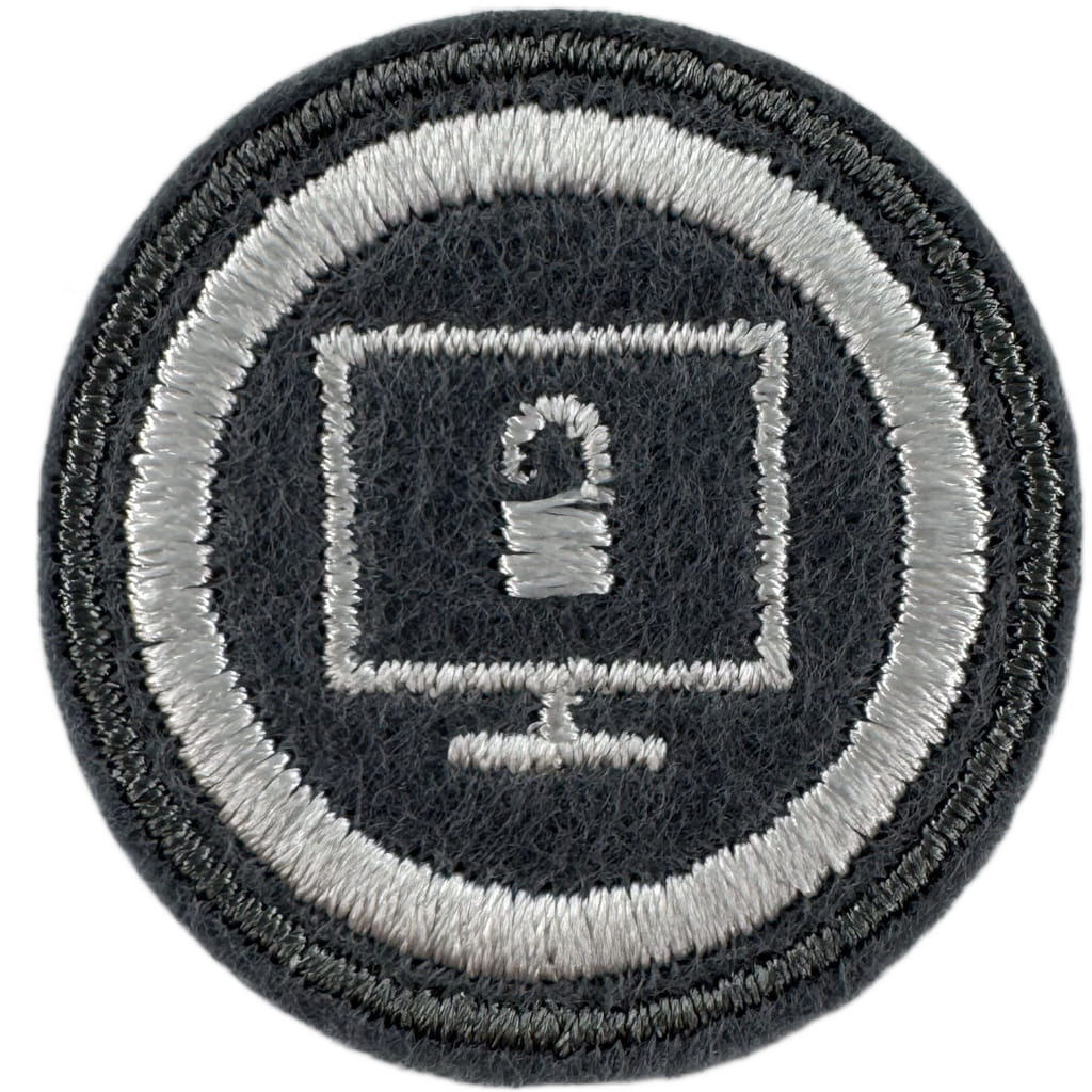 Sprawności harcerskie ZHR żeńskie o średnicy 30mm, haftowana białą nicią na szarym filcu.