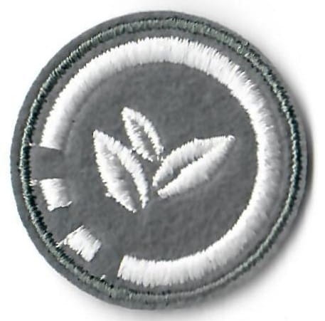 Sprawności harcerskie ZHR żeńskie o średnicy 30mm, haftowana białą nicią na szarym filcu.
