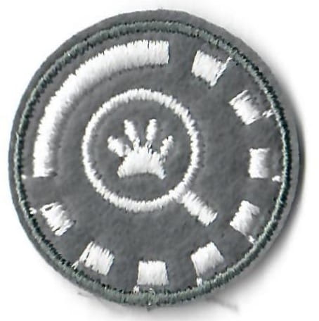 Sprawności harcerskie ZHR żeńskie o średnicy 30mm, haftowana białą nicią na szarym filcu.