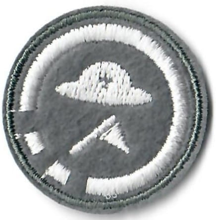 Sprawności harcerskie ZHR żeńskie o średnicy 30mm, haftowana białą nicią na szarym filcu.