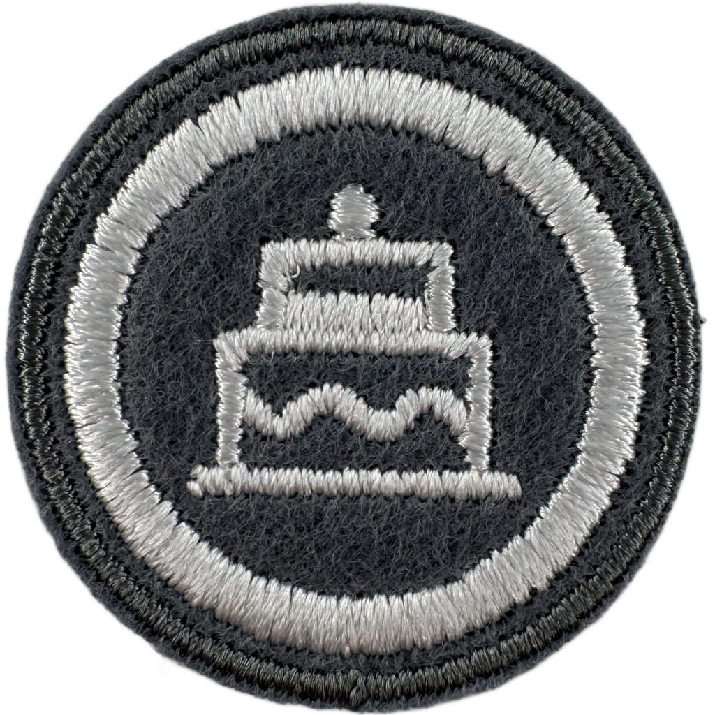 Sprawności harcerskie ZHR żeńskie o średnicy 30mm, haftowana białą nicią na szarym filcu.