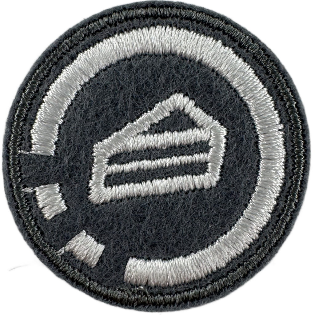 Sprawności harcerskie ZHR żeńskie o średnicy 30mm, haftowana białą nicią na szarym filcu.