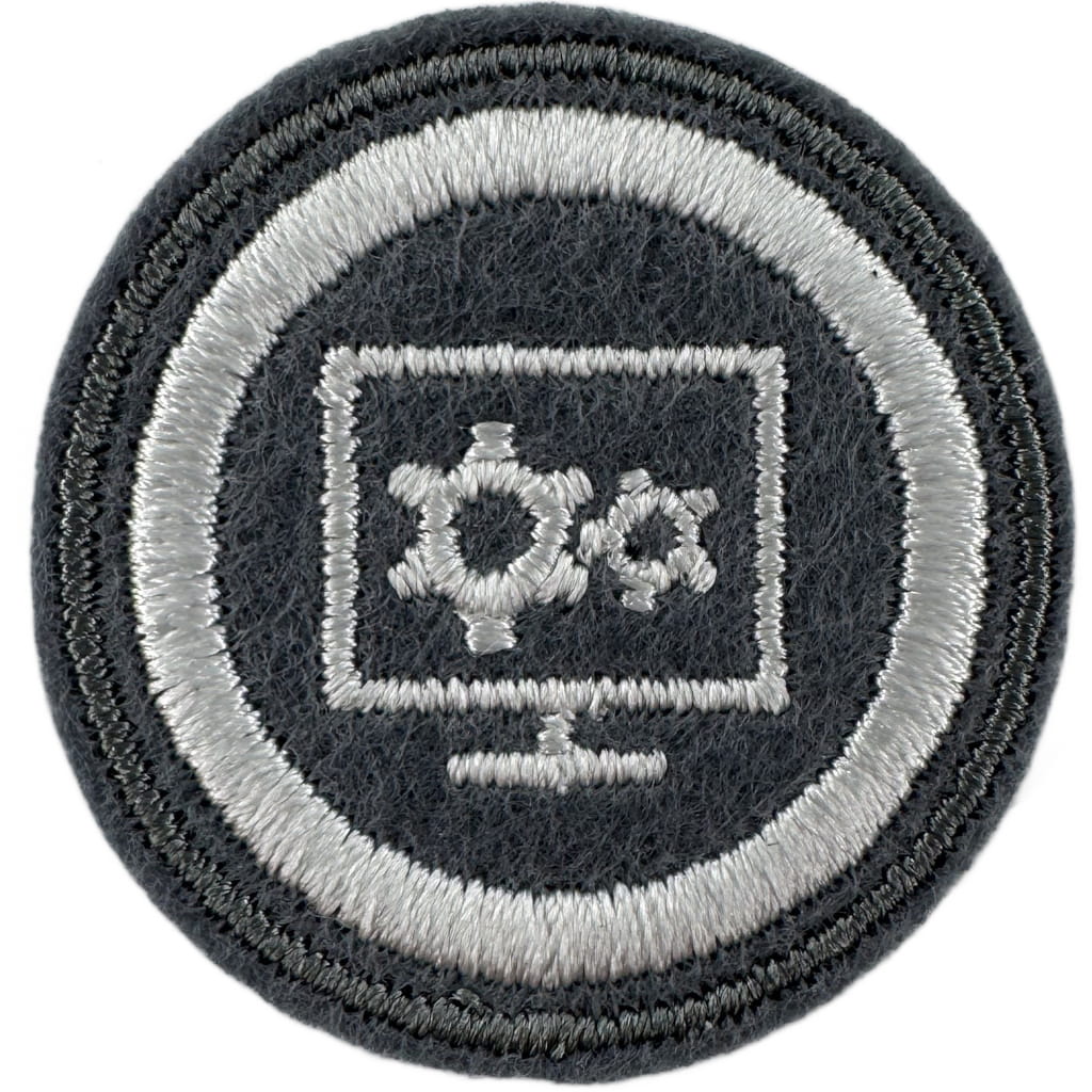 Sprawności harcerskie ZHR żeńskie o średnicy 30mm, haftowana białą nicią na szarym filcu.