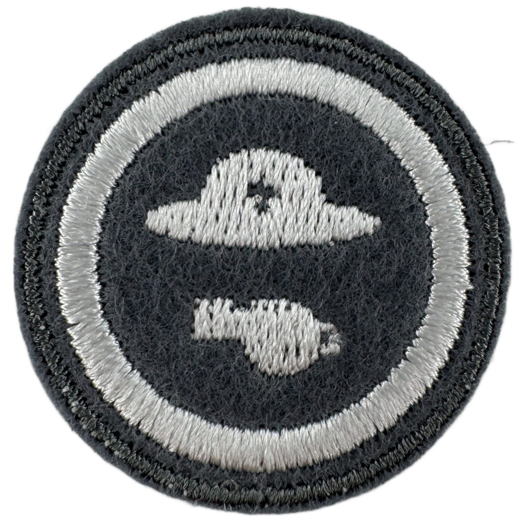 Sprawności harcerskie ZHR żeńskie o średnicy 30mm, haftowana białą nicią na szarym filcu.