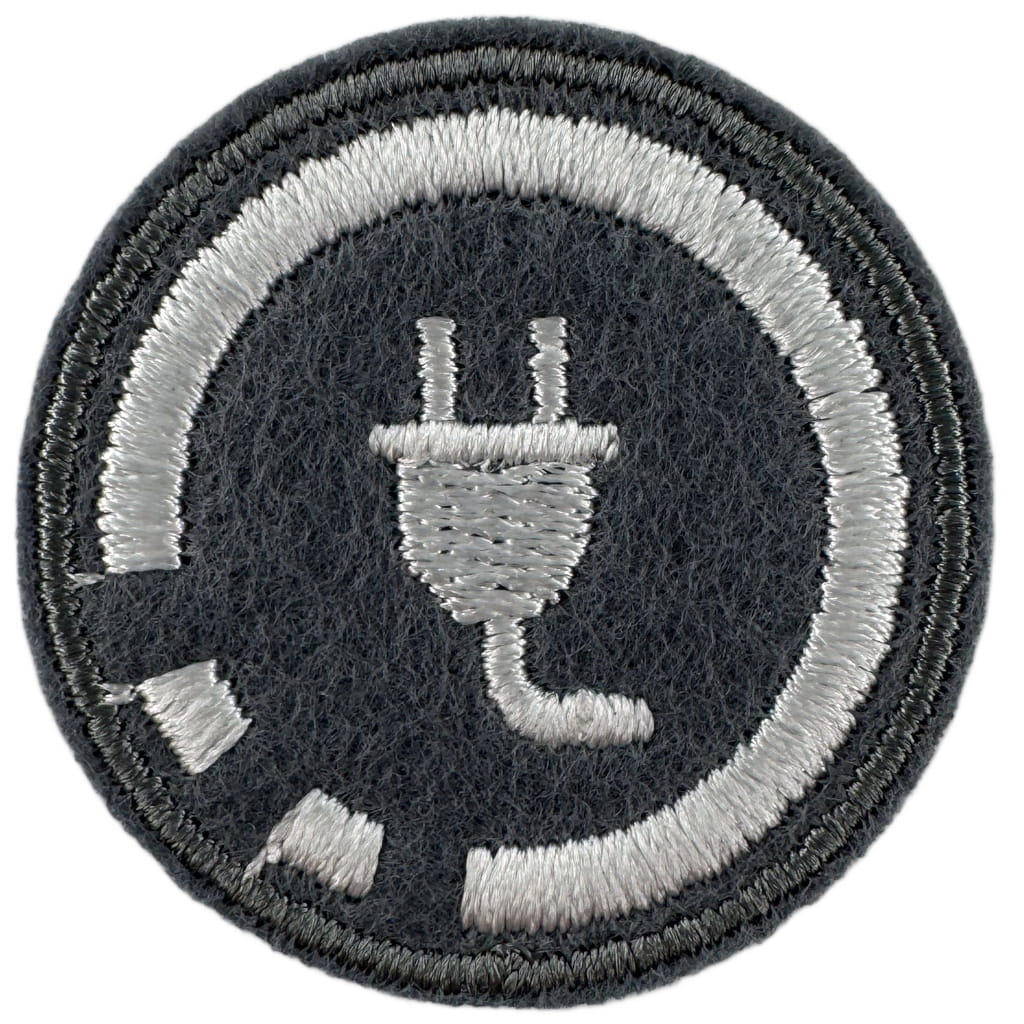Sprawności harcerskie ZHR żeńskie o średnicy 30mm, haftowana białą nicią na szarym filcu.