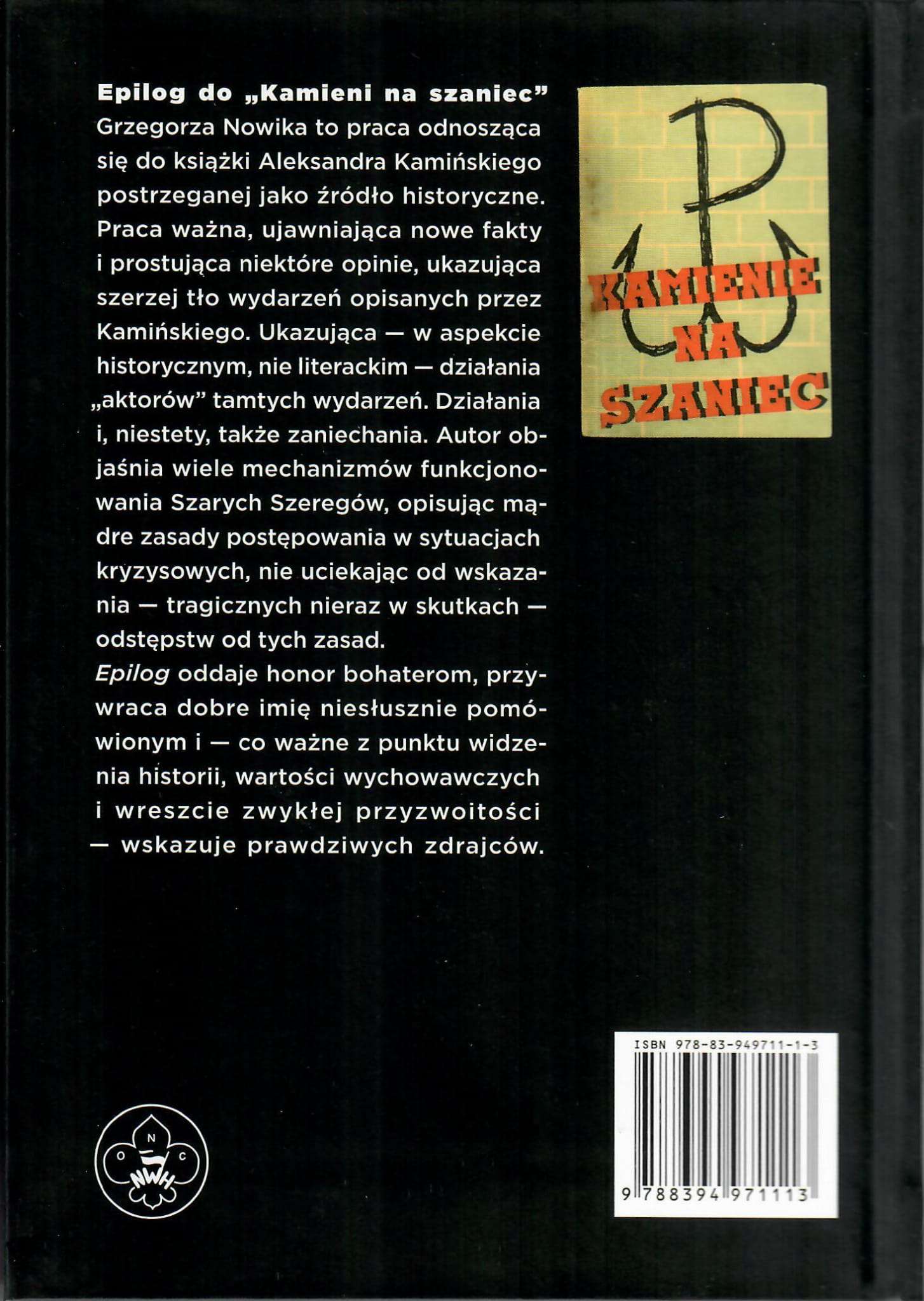 Trzecie wydanie cieszącej się wielkim zainteresowaniem i poszukiwanej pracy prof. Grzegorza Nowika. Epilog do Kamieni na szaniec to praca odnosząca się do legendarnej książki Aleksandra Kamińskiego - ważna, prostująca niektóre fakty i opinie, ukazująca szerzej tło wydarzeń opisanych przez Kamińskiego. Ukazująca - w aspekcie historycznym, nie literackim - działania „aktorów” tamtych wydarzeń. Autor objaśnia też wiele mechanizmów funkcjonowania Szarych Szeregów, opisując mądre zasady postępowania w sytuacjach kryzysowych, ale nie uciekając też od wskazania - tragicznych nieraz w skutkach - odstępstw od tych zasad. Autor pokazuje też, jak harcerze radzili sobie z odpowiedzialnością, jaka na nich spoczęła w czasie wojny. Odpowiedzialnością, wydawałoby się, znacznie przerastającą ich wiek i doświadczenie, której jednak - mimo nieuchronnych błędów - w ogromnej większości sprostali z godnością i odwagą.
