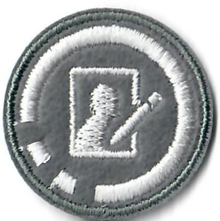 Sprawności harcerskie ZHR żeńskie o średnicy 30mm, haftowana białą nicią na szarym filcu.