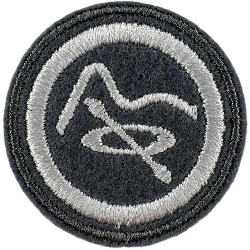 Sprawności harcerskie ZHR żeńskie o średnicy 30mm, haftowana białą nicią na szarym filcu.