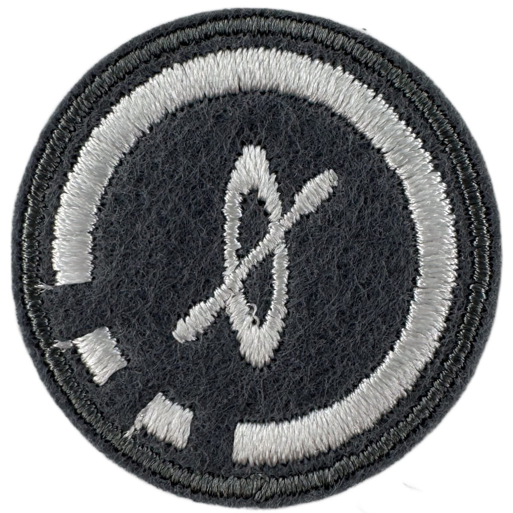 Sprawności harcerskie ZHR żeńskie o średnicy 30mm, haftowana białą nicią na szarym filcu.