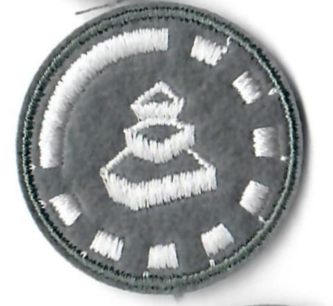 Sprawności harcerskie ZHR żeńskie o średnicy 30mm, haftowana białą nicią na szarym filcu.