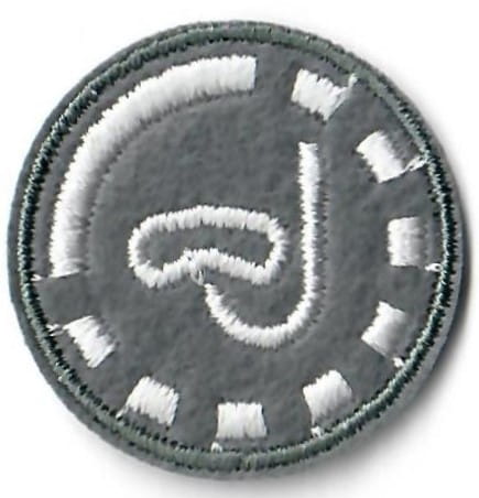 Sprawności harcerskie ZHR żeńskie o średnicy 30mm, haftowana białą nicią na szarym filcu.