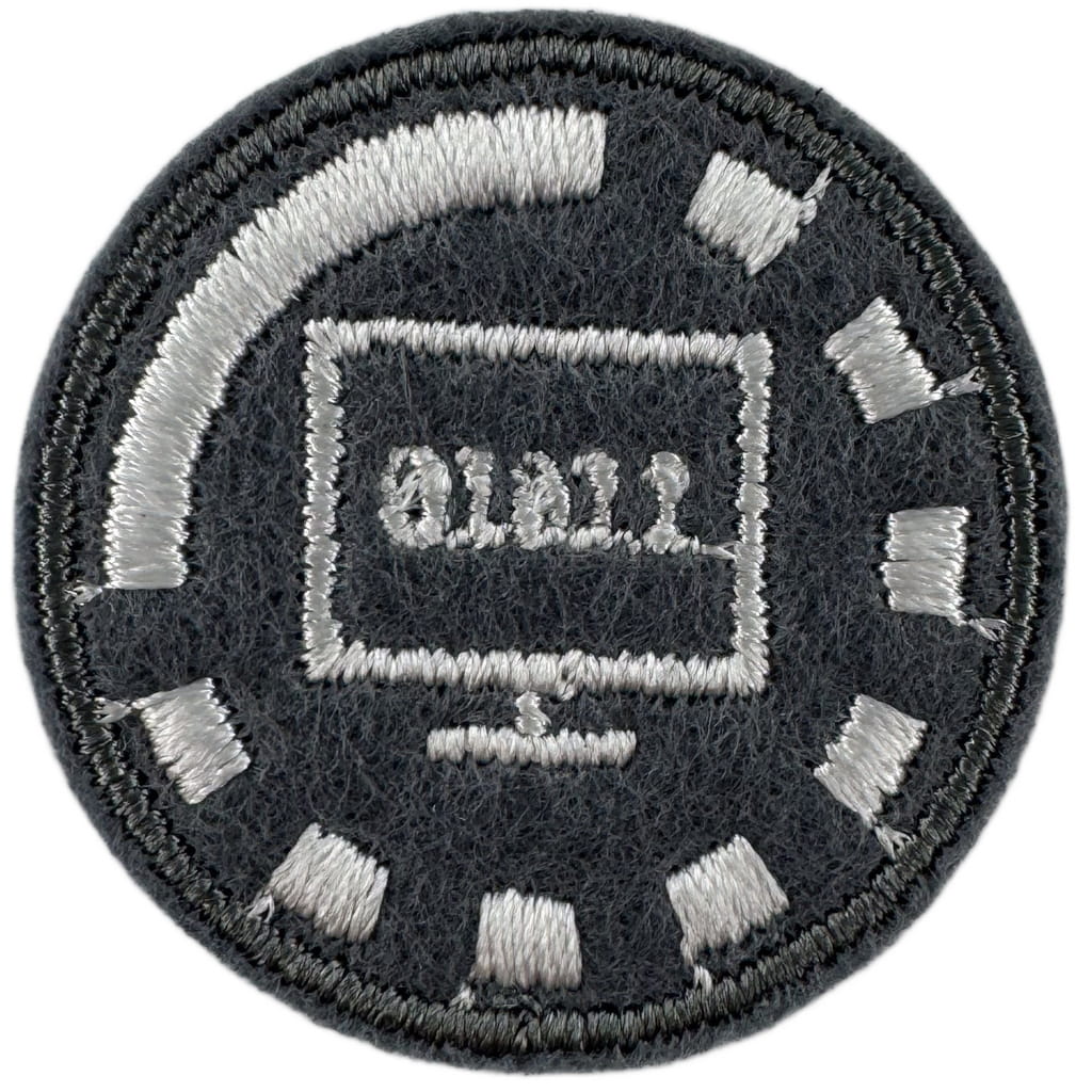 Sprawności harcerskie ZHR żeńskie o średnicy 30mm, haftowana białą nicią na szarym filcu.