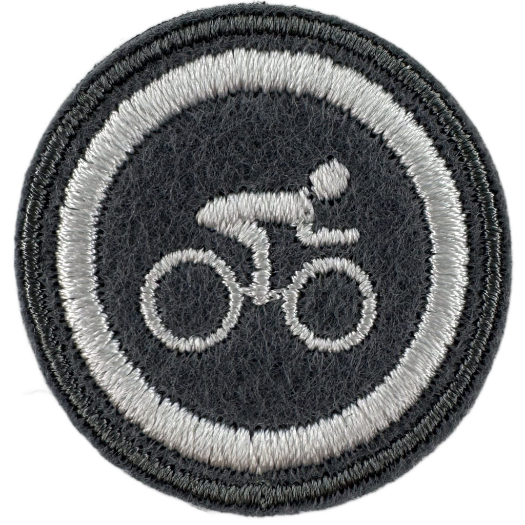 Sprawności harcerskie ZHR żeńskie o średnicy 30mm, haftowana białą nicią na szarym filcu.