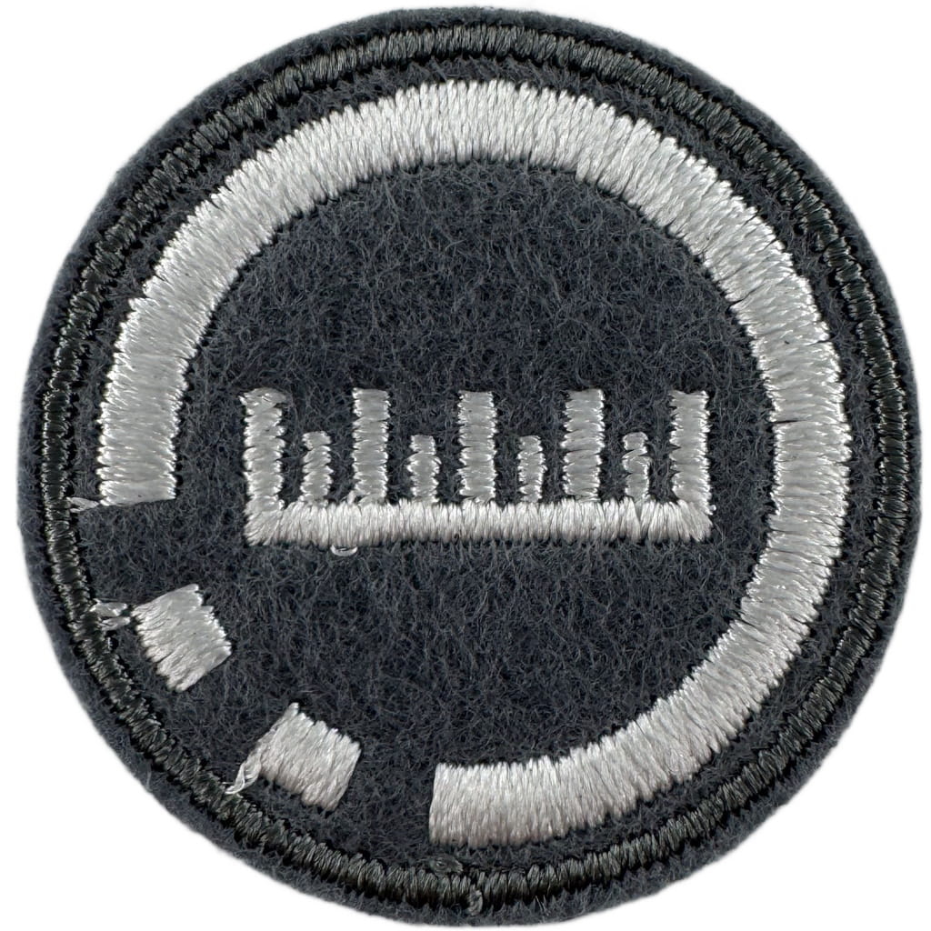 Sprawności harcerskie ZHR żeńskie o średnicy 30mm, haftowana białą nicią na szarym filcu.