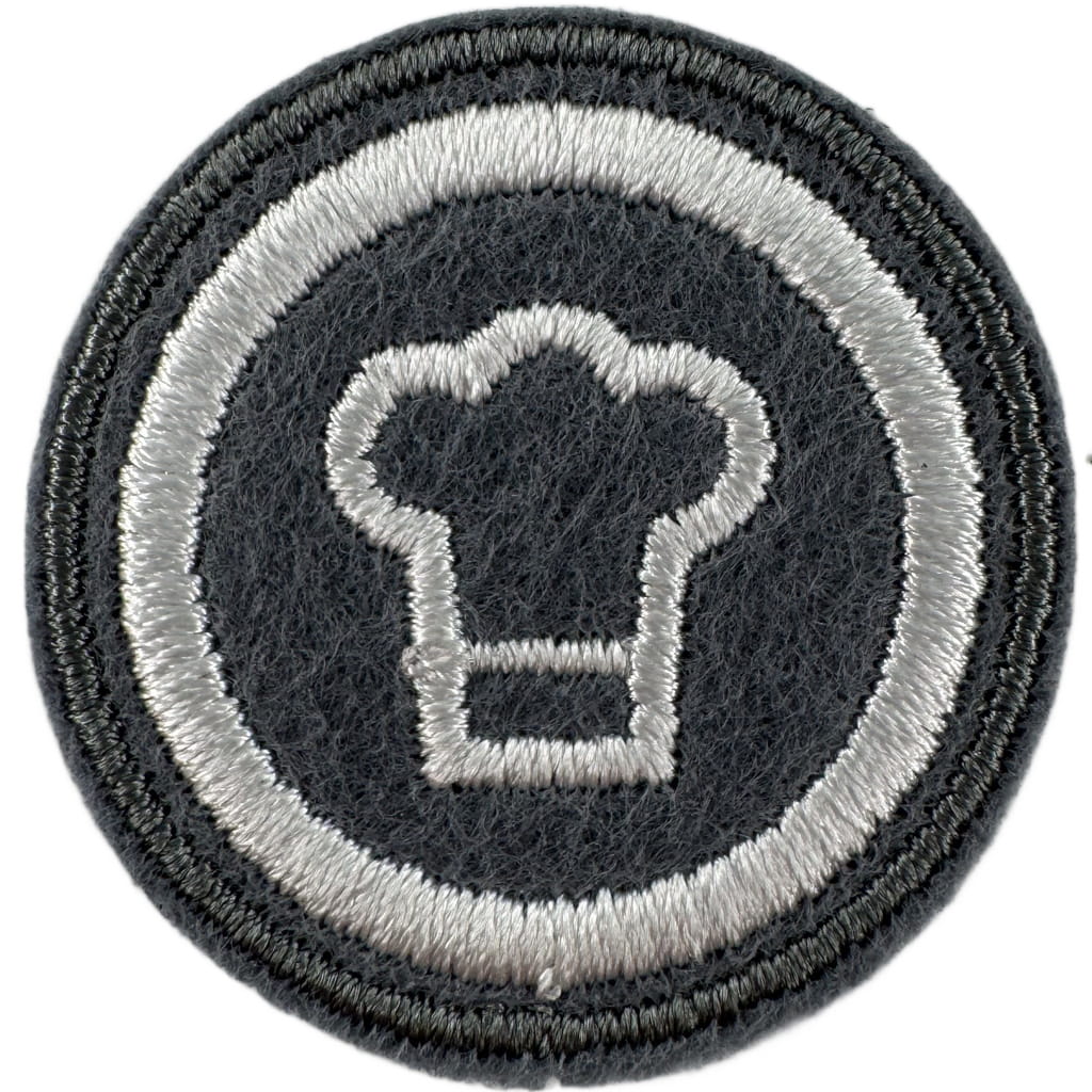 Sprawności harcerskie ZHR żeńskie o średnicy 30mm, haftowana białą nicią na szarym filcu.