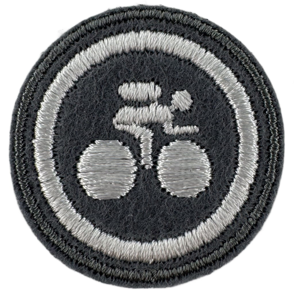 Sprawności harcerskie ZHR żeńskie o średnicy 30mm, haftowana białą nicią na szarym filcu.