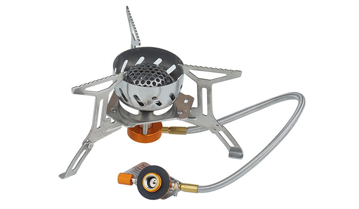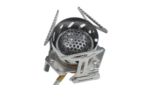 Wolnostojąca kuchenka turystyczna o mocy do 2200 W, z palnikiem zabezpieczonym siatką Beehive™, wężem doprowadzającym paliwo i krzesiwem Fire Maple FMP-709.