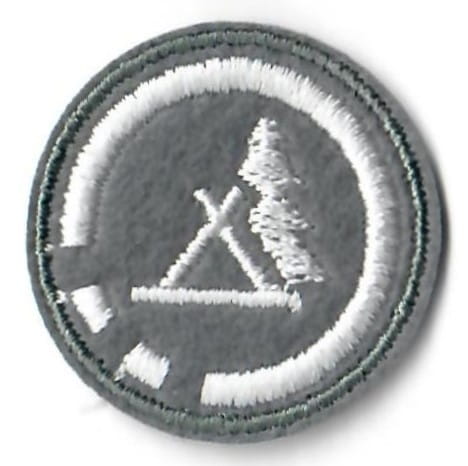 Sprawności harcerskie ZHR żeńskie o średnicy 30mm, haftowana białą nicią na szarym filcu.