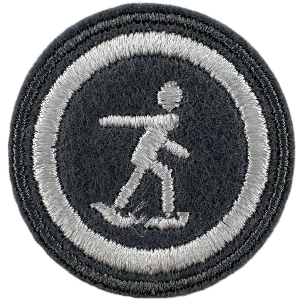 Sprawności harcerskie ZHR żeńskie o średnicy 30mm, haftowana białą nicią na szarym filcu.
