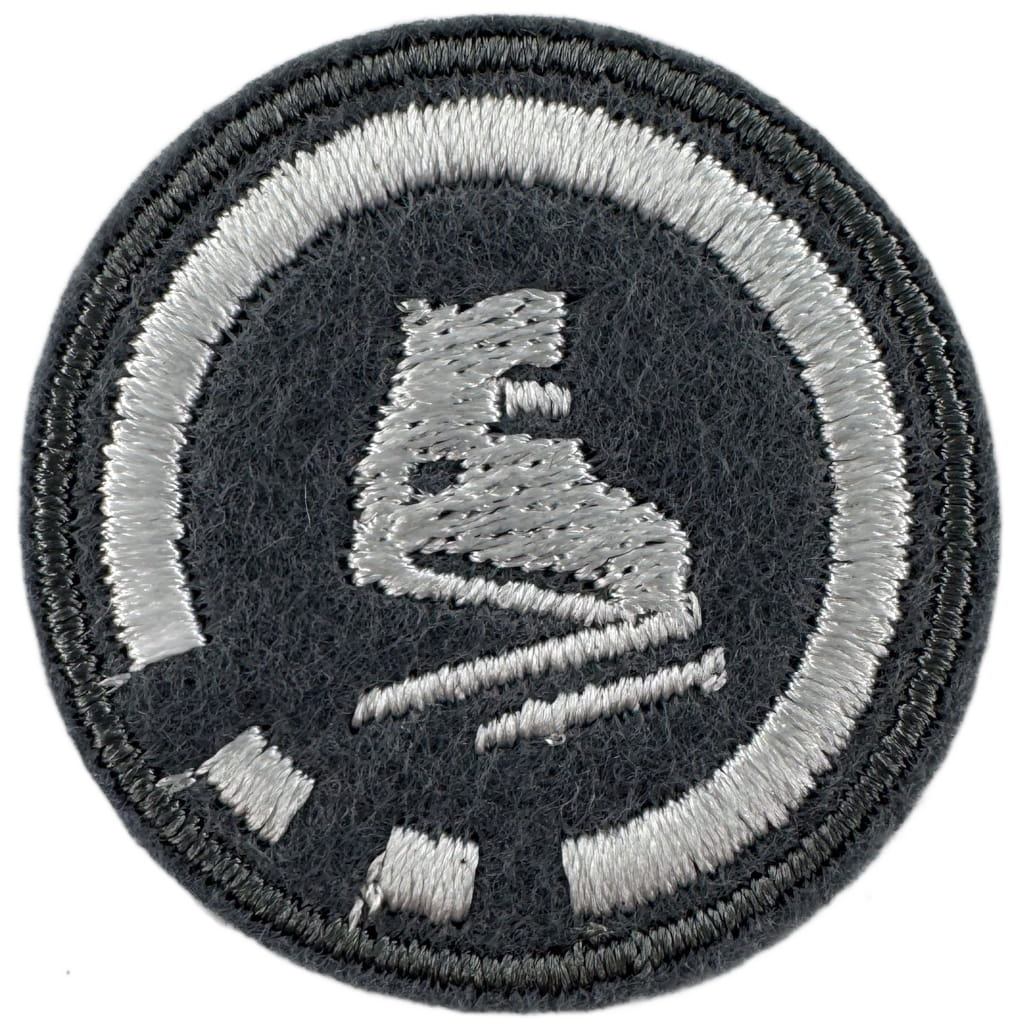 Sprawności harcerskie ZHR żeńskie o średnicy 30mm, haftowana białą nicią na szarym filcu.
