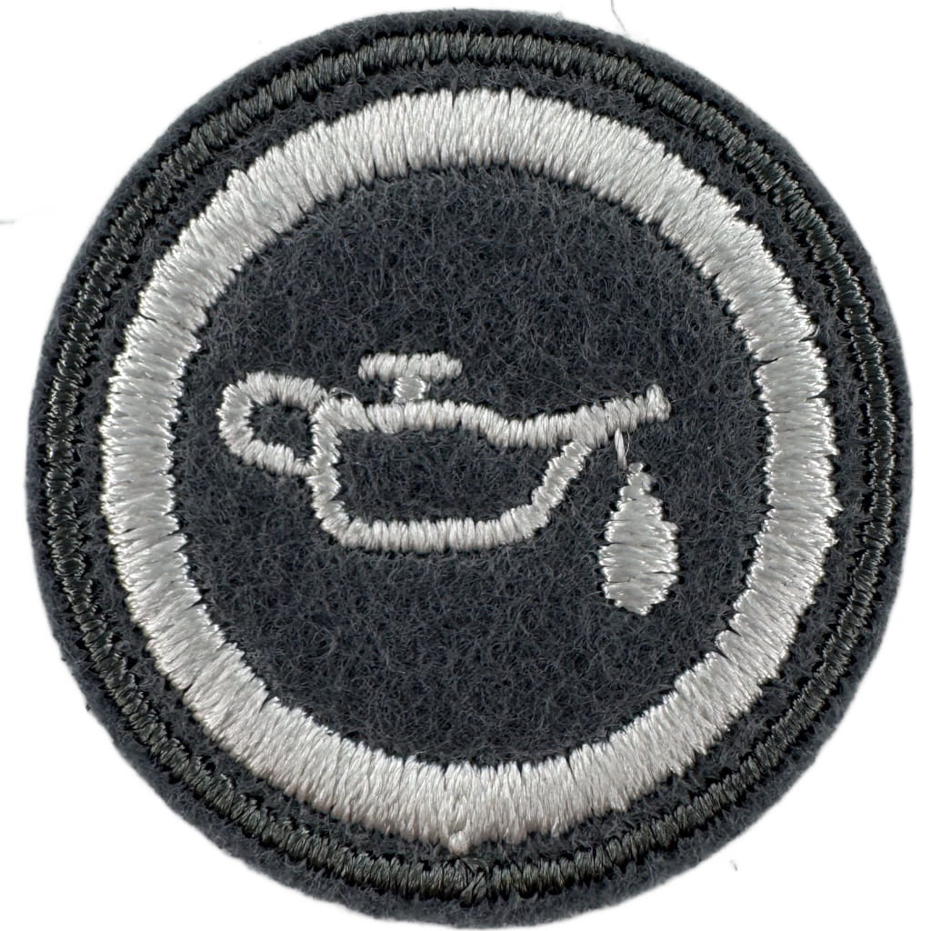 Sprawności harcerskie ZHR żeńskie o średnicy 30mm, haftowana białą nicią na szarym filcu.