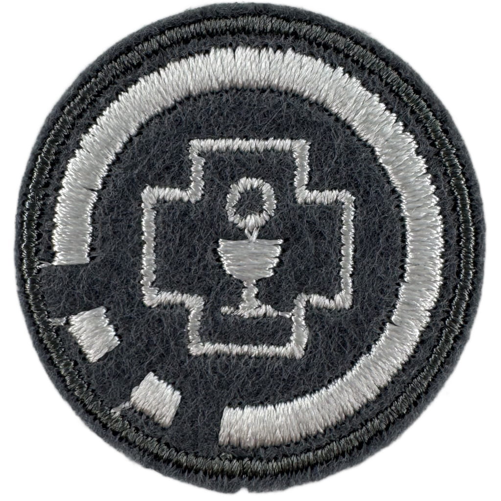 Sprawności harcerskie ZHR żeńskie o średnicy 30mm, haftowana białą nicią na szarym filcu.
