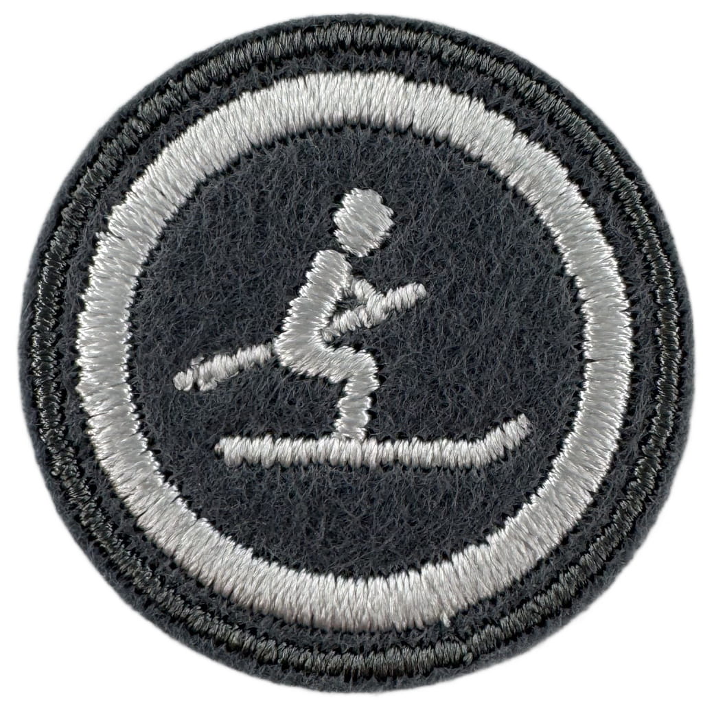 Sprawności harcerskie ZHR żeńskie o średnicy 30mm, haftowana białą nicią na szarym filcu.