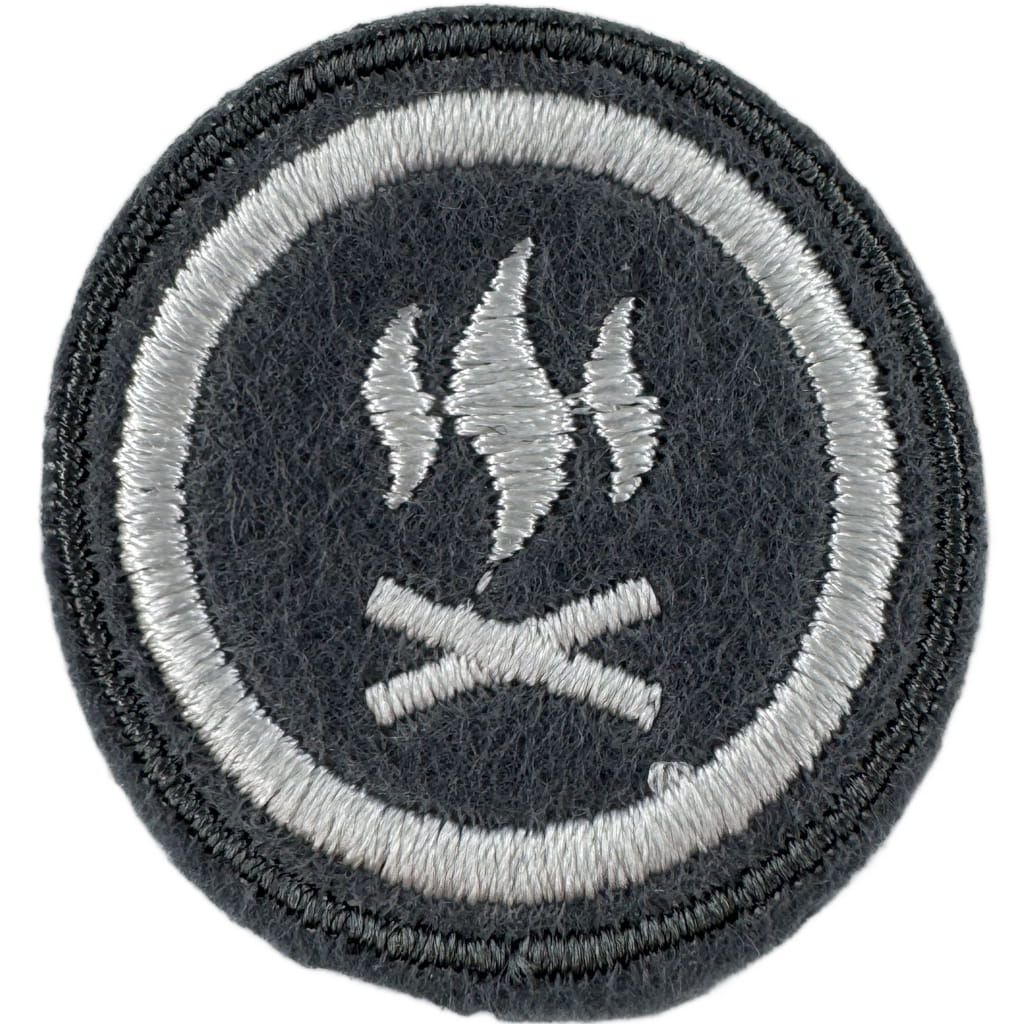 Sprawności harcerskie ZHR żeńskie o średnicy 30mm, haftowana białą nicią na szarym filcu.
