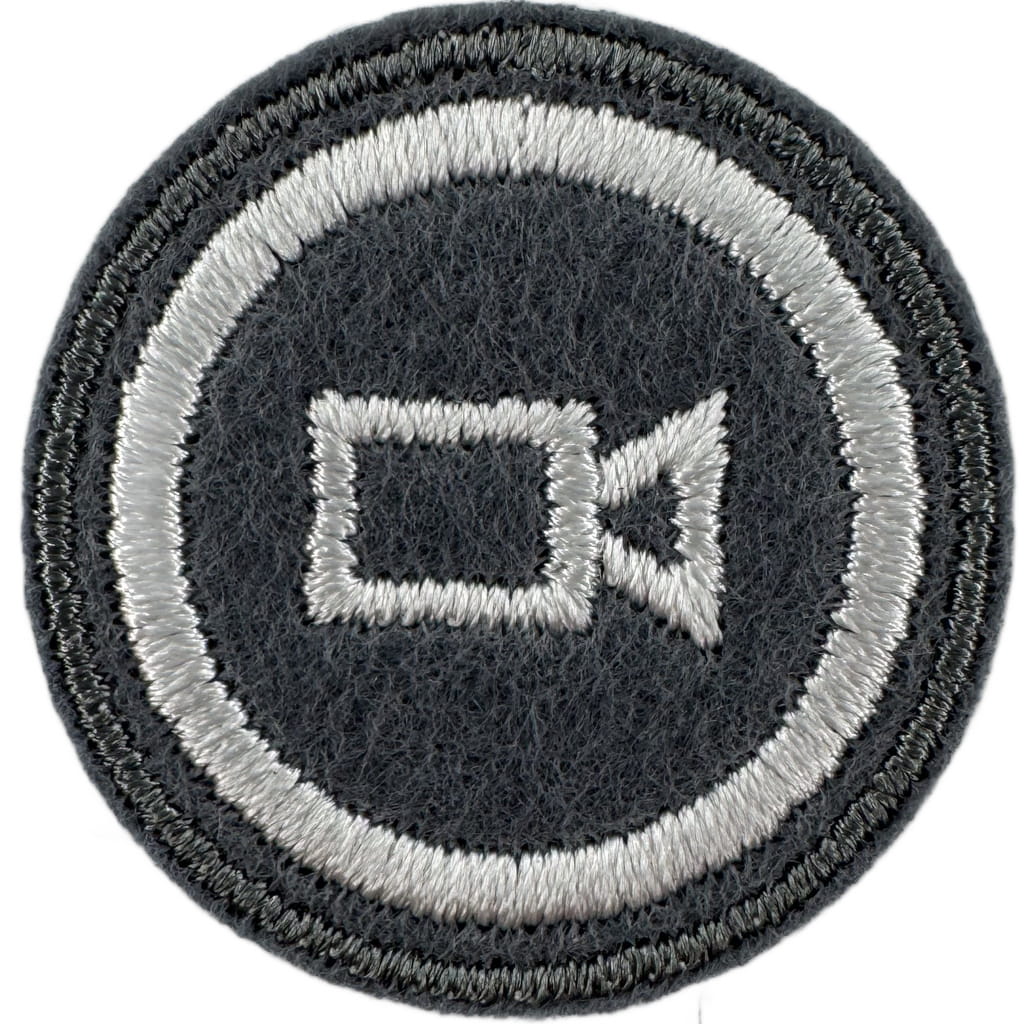Sprawności harcerskie ZHR żeńskie o średnicy 30mm, haftowana białą nicią na szarym filcu.