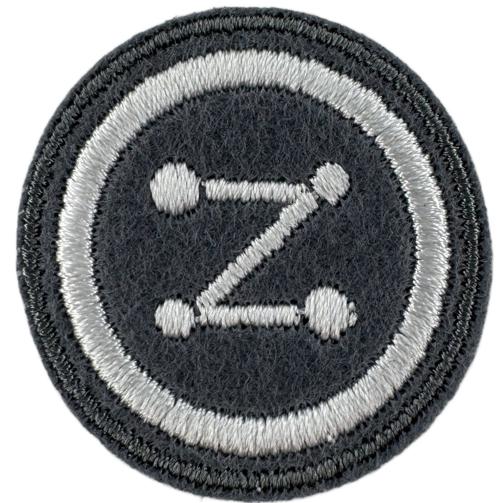 Sprawności harcerskie ZHR żeńskie o średnicy 30mm, haftowana białą nicią na szarym filcu.