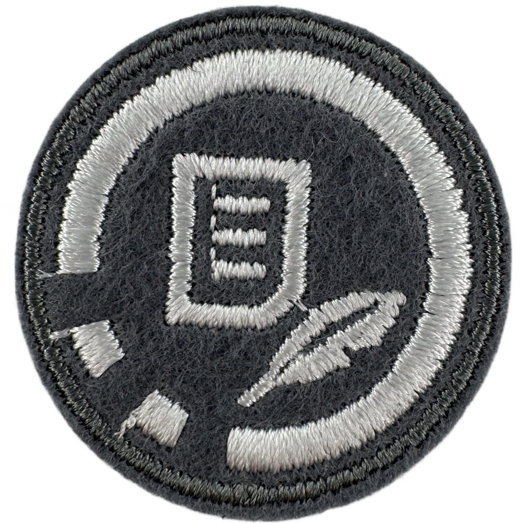 Sprawności harcerskie ZHR żeńskie o średnicy 30mm, haftowana białą nicią na szarym filcu.