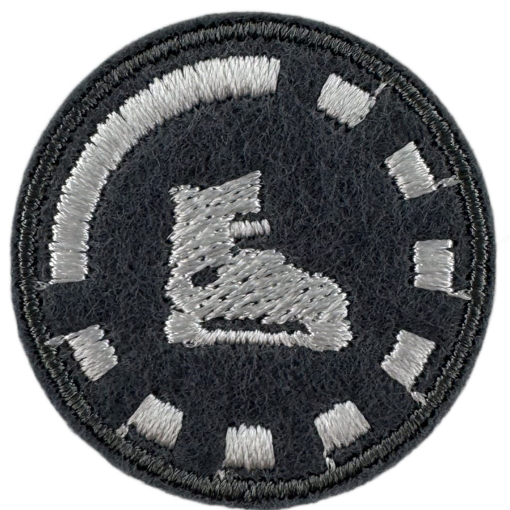 Sprawności harcerskie ZHR żeńskie o średnicy 30mm, haftowana białą nicią na szarym filcu.