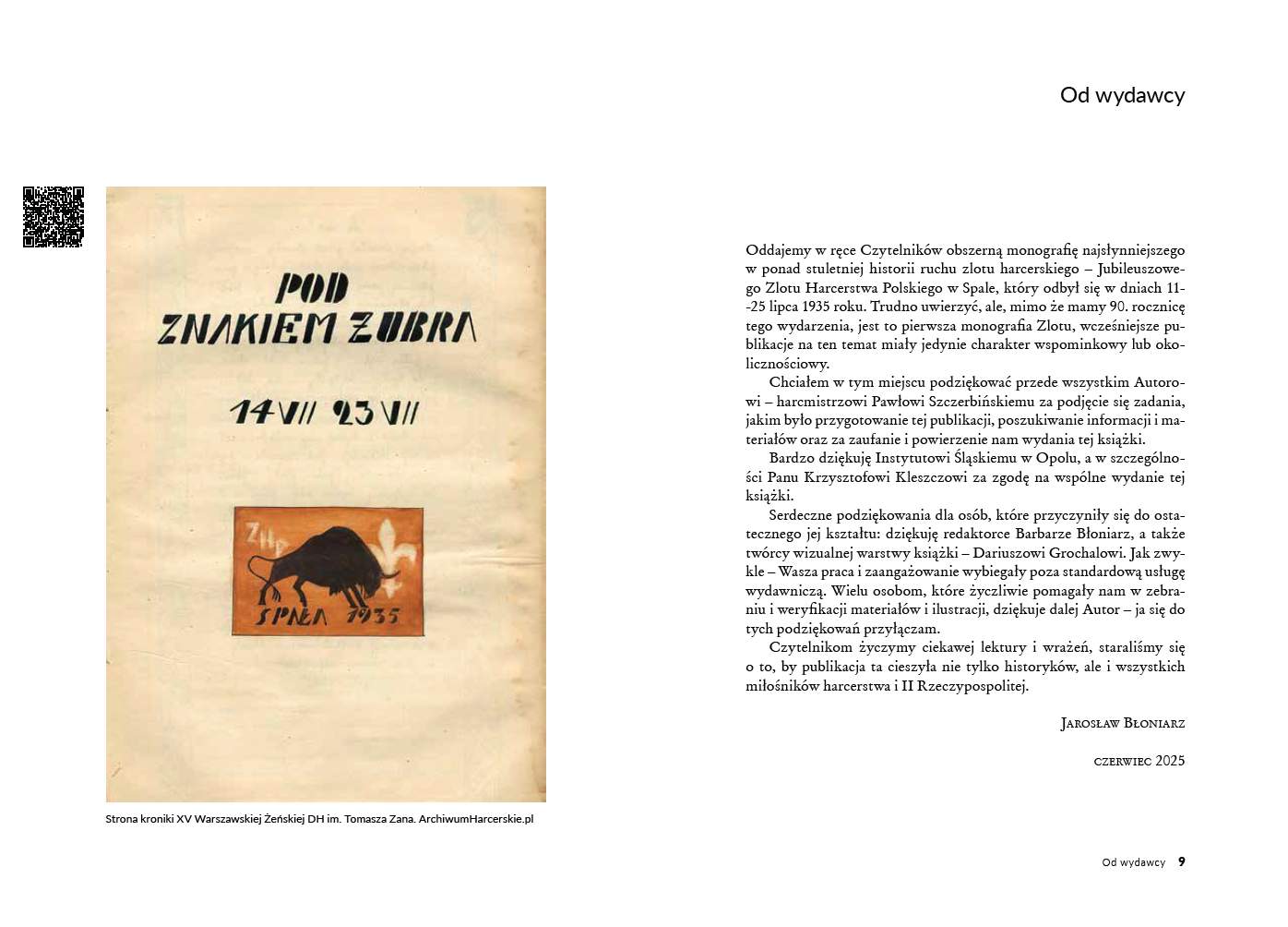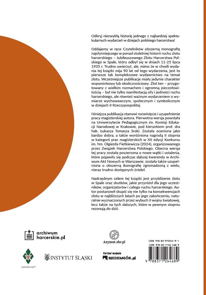 Oddajemy w ręce Czytelników obszerną monografię najsłynniejszego w ponad stuletniej historii ruchu zlotu harcerskiego – Jubileuszowego Zlotu Harcerstwa Polskiego w Spale, który odbył się w dniach 11-25 lipca 1935 r. Trudno uwierzyć, ale, mimo że w chwili wydania tej książki mija 90 lat od tego wydarzenia, jest to pierwsze tak kompleksowe wydawnictwo na temat zlotu. Wcześniejsze publikacje miały jedynie charakter wspominkowy lub okolicznościowy. Zlot ten – przygotowany z wielkim rozmachem i ogromną pieczołowitością – był nie tylko manifestacją siły i jedności ruchu harcerskiego, ale również ważnym wydarzeniem o wymiarze wychowawczym, społecznym i symbolicznym w dziejach II Rzeczypospolitej.