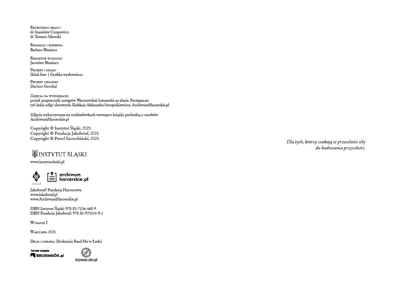 Niniejsza publikacja stanowi rozwinięcie i uzupełnienie pracy magisterskiej autora. Pierwotna wersja powstała na Uniwersytecie Pedagogicznym im. Komisji Edukacji Narodowej w Krakowie, pod kierunkiem prof. dra hab. Łukasza Tomasza Sroki. Została oceniona jako bardzo dobra, a także wyróżniona nagrodą II stopnia w kategorii prac magisterskich w XII edycji Konkursu im. hm. Olgierda Fietkiewicza (2024), organizowanego przez Związek Harcerstwa Polskiego. Obecna wersja tej pracy została poszerzona o nowe wątki i ustalenia, które pojawiły się podczas dalszej kwerendy w Archiwum Akt Nowych w Warszawie; została także uzupełniona o obszerną ikonografię zgromadzoną z wielu, nieraz trudno dostępnych źródeł.