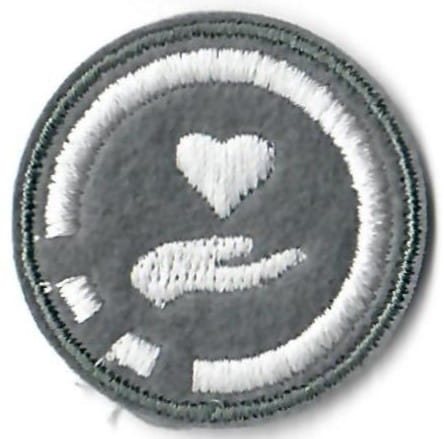 Sprawności harcerskie ZHR żeńskie o średnicy 30mm, haftowana białą nicią na szarym filcu.