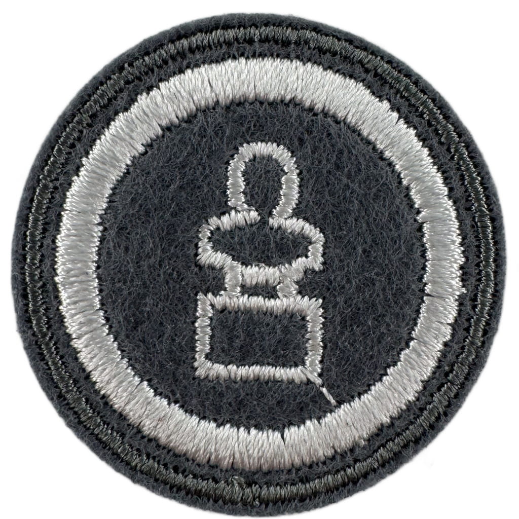 Sprawności harcerskie ZHR żeńskie o średnicy 30mm, haftowana białą nicią na szarym filcu.