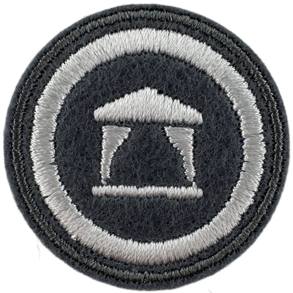 Sprawności harcerskie ZHR żeńskie o średnicy 30mm, haftowana białą nicią na szarym filcu.