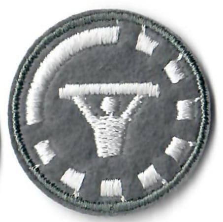 Sprawności harcerskie ZHR żeńskie o średnicy 30mm, haftowana białą nicią na szarym filcu.