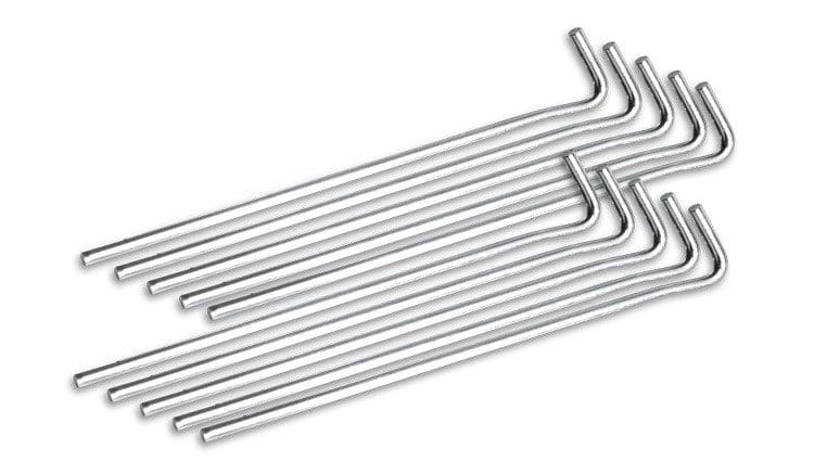 Zestaw 10 sztuk klasycznych szpilek namiotowych o długości 19 cm, wykonanych z wytrzymałego drutu stalowego o średnicy 5 mm.