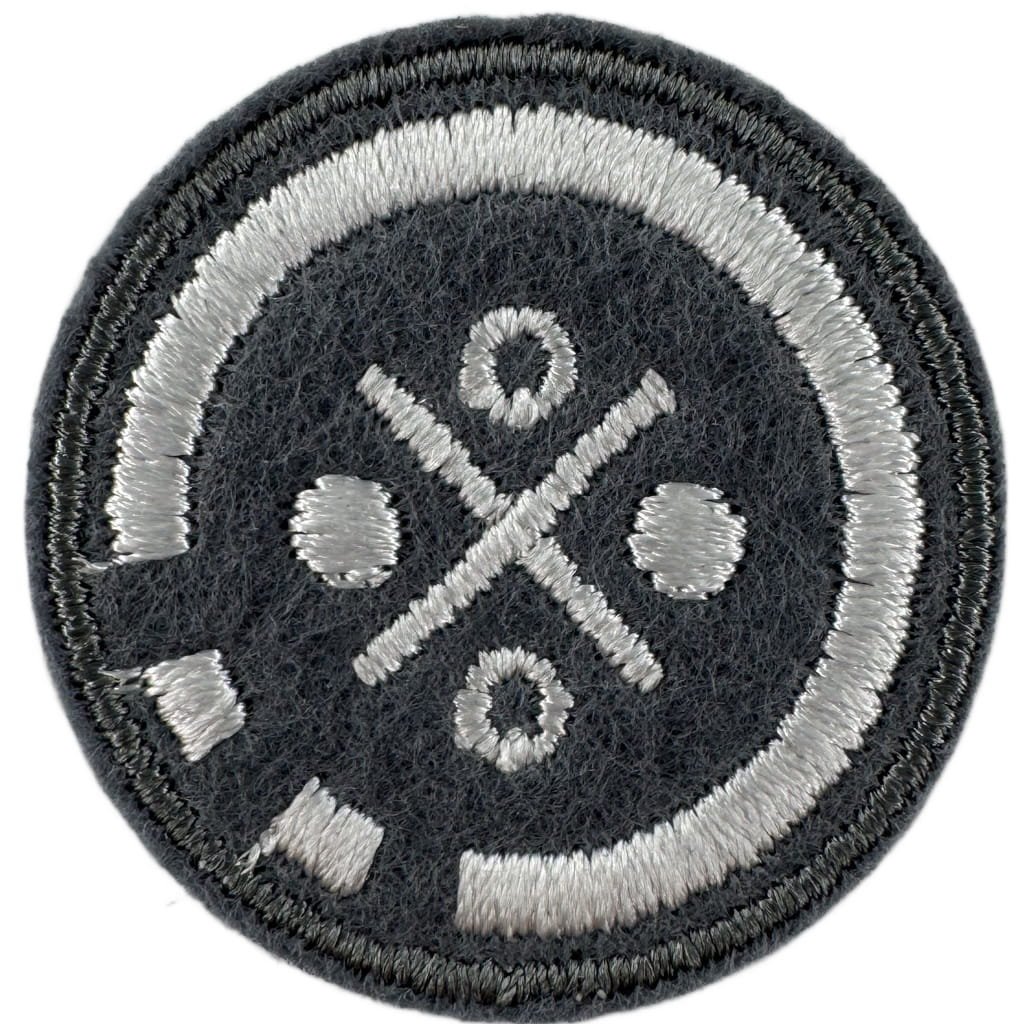 Sprawności harcerskie ZHR żeńskie o średnicy 30mm, haftowana białą nicią na szarym filcu.