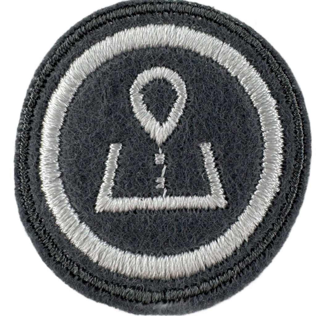 Sprawności harcerskie ZHR żeńskie o średnicy 30mm, haftowana białą nicią na szarym filcu.