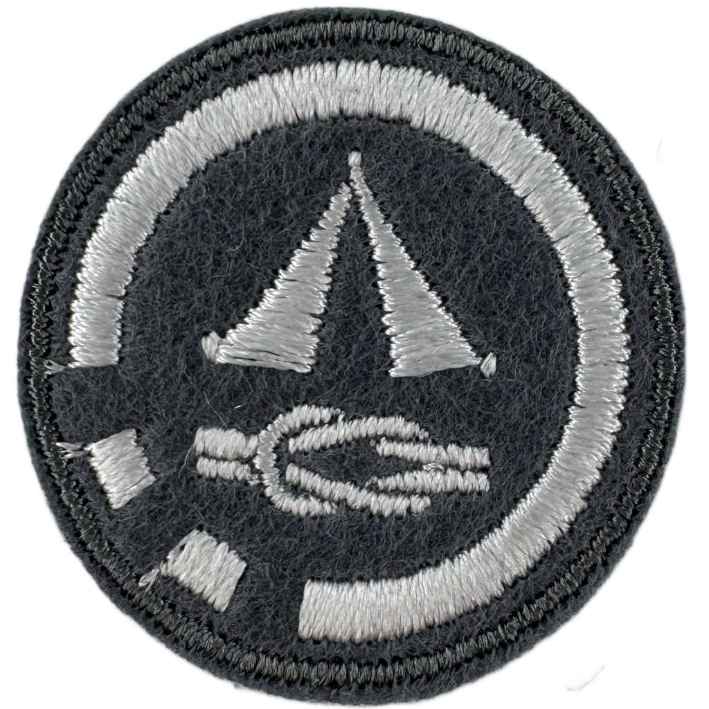 Sprawności harcerskie ZHR żeńskie o średnicy 30mm, haftowana białą nicią na szarym filcu.