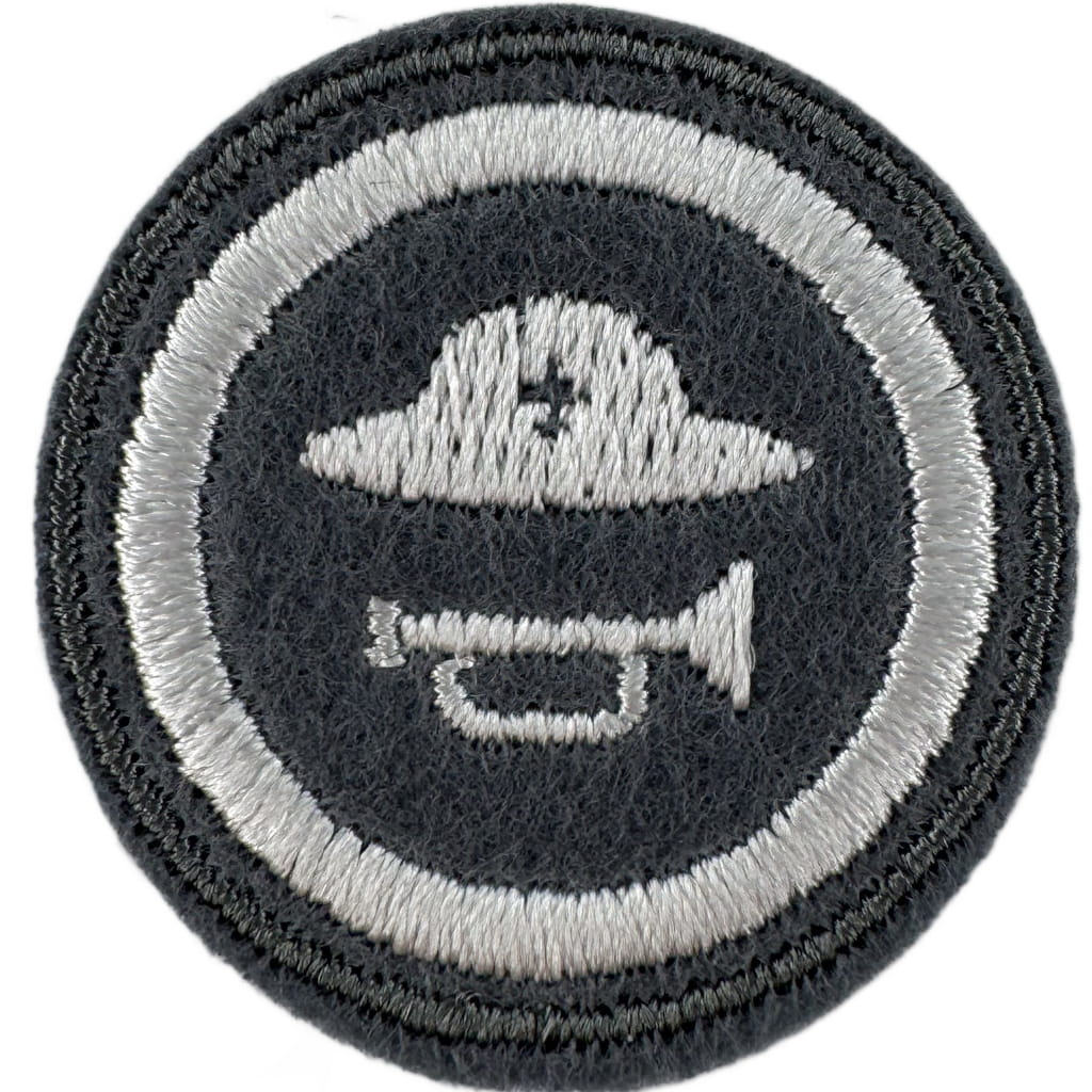Sprawności harcerskie ZHR żeńskie o średnicy 30mm, haftowana białą nicią na szarym filcu.