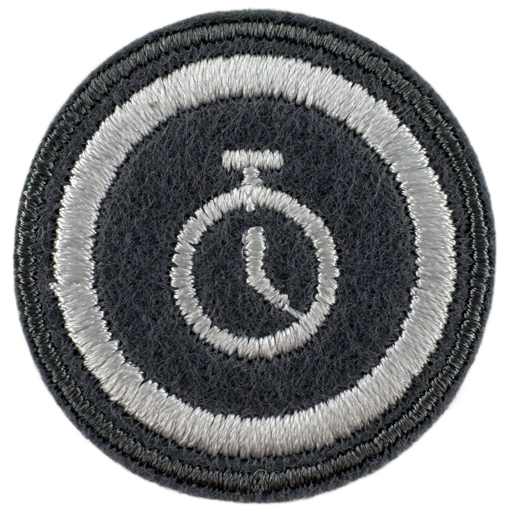 Sprawności harcerskie ZHR żeńskie o średnicy 30mm, haftowana białą nicią na szarym filcu.