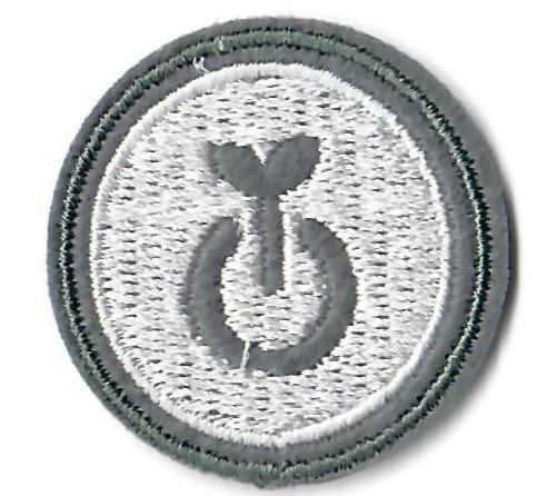Sprawności harcerskie ZHR żeńskie o średnicy 30mm, haftowana białą nicią na szarym filcu.