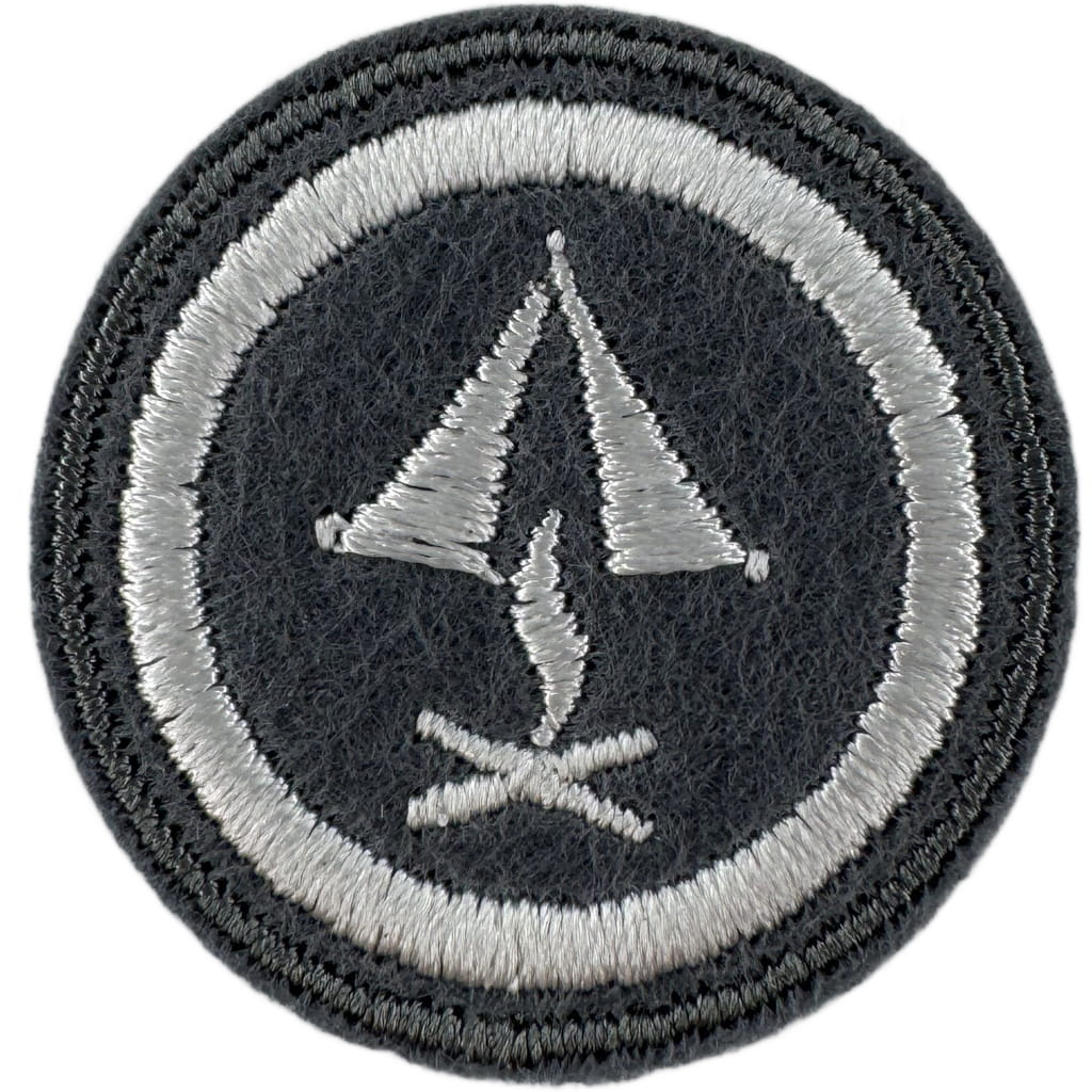 Sprawności harcerskie ZHR żeńskie o średnicy 30mm, haftowana białą nicią na szarym filcu.