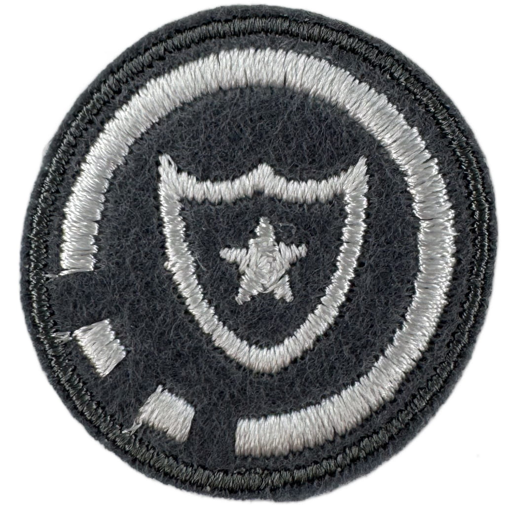 Sprawności harcerskie ZHR żeńskie o średnicy 30mm, haftowana białą nicią na szarym filcu.