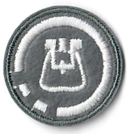 Sprawności harcerskie ZHR żeńskie o średnicy 30mm, haftowana białą nicią na szarym filcu.