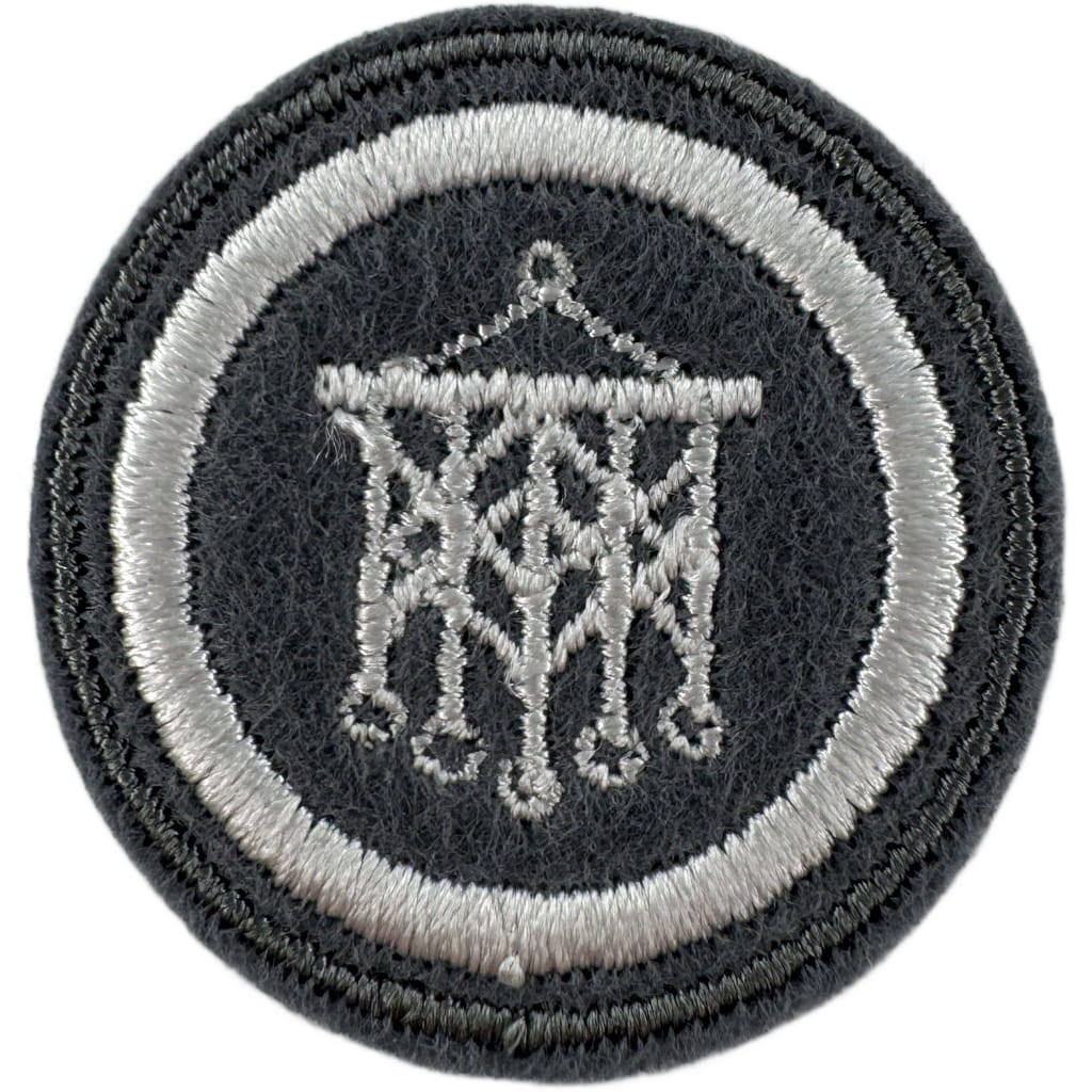 Sprawności harcerskie ZHR żeńskie o średnicy 30mm, haftowana białą nicią na szarym filcu.