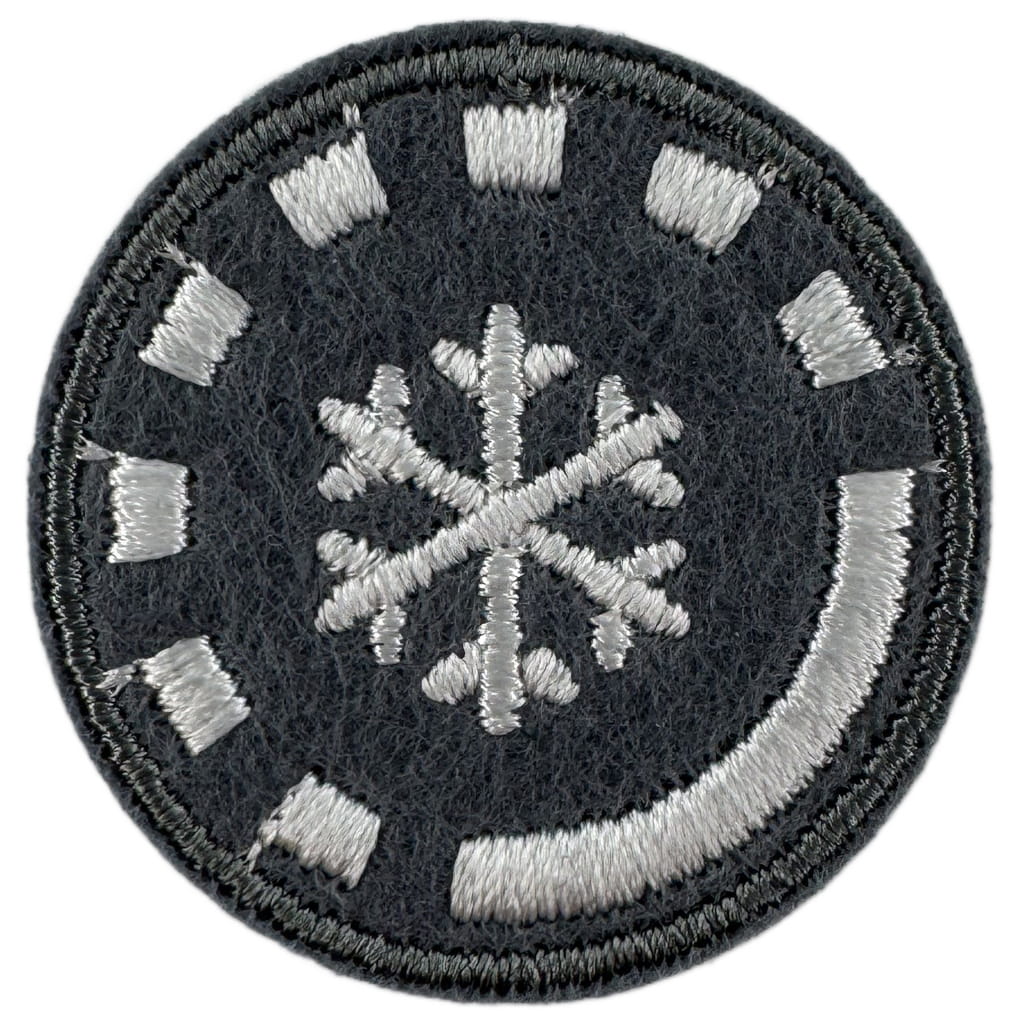 Sprawności harcerskie ZHR żeńskie o średnicy 30mm, haftowana białą nicią na szarym filcu.